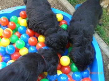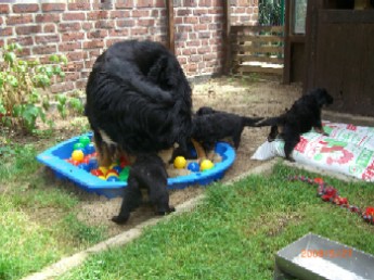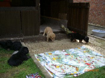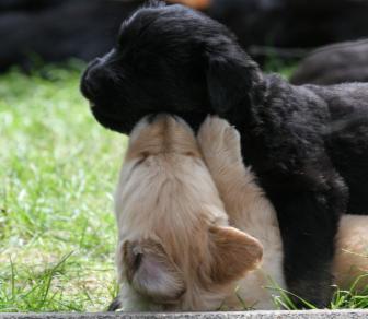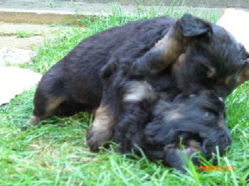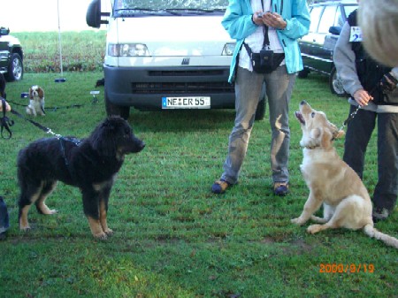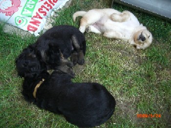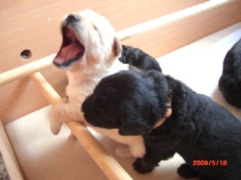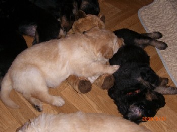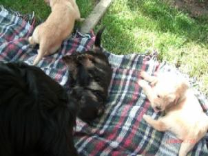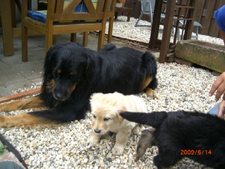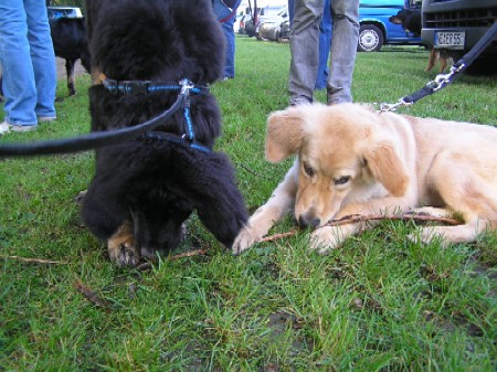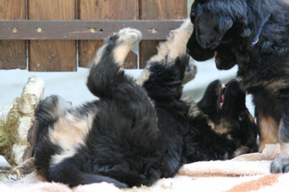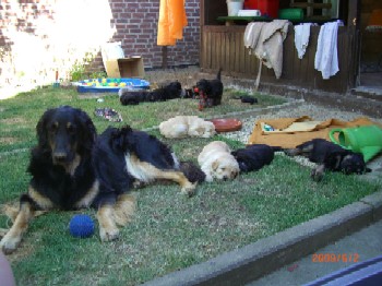 Brrrr.... Ist das Wetter nicht einfach usselig? Wie gut das meine Kleinen so vernünftig sind und nur zum Pipimachen und knoddeln in den Regen gehen1 Ansonsten machen wir einfach Benimmübungen und mein Frauchen übt "Sitz" mit den Kleinen, Das klappt auch schon sehr gut!!! Ich bin ja schon stolz auf die kleinen Racker! Aber hier mal wider ein paar Bilder, wenn auch nur damit Ihr mal wieder seht wie sie gewachsen sind. Ansonsten hat Frauchen vor, die Bilder "Damals und Heute" auf der Seite "Welpen noch mal aus zu tauschen. Jetzt sehen sie ja schon wie kleine Hovi's aus! Wir hatten ja schon vor zusammen nach Niederelvenich zur Körung zu fahren um die Großen dort ein wenig durcheinander zu bringen, aber das wäre ja gemein!!! Aber wir hätten bestimmt Spaß!